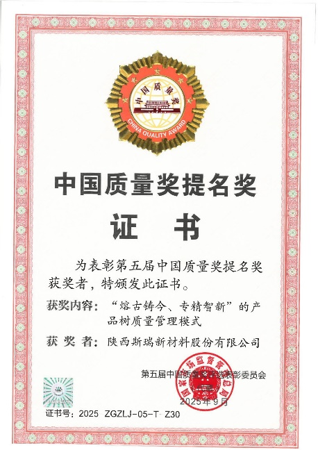 2025年9月16日,中國質量獎評選結果正式揭曉。斯瑞新材憑借“熔古鑄今、專精智新”的產品樹質量管理模式在651家優秀企業中脫穎而出,榮獲中國質量領域的榮譽——中國質量獎提名獎。